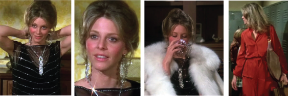 Seven different fabulous wardrobe changes in this second episode. The gray flannel top with dark vest design was a repeat from Part 1. My faves were the sequined black evening gown and the short-sleeved yellow jumpsuit. While I’m never crazy about seeing animal furs worn, it was not something that came out of Jaime’s own closet so Ima forgive this “Malibu Mink,” and blame it on Harris for forcing her to wear it!